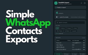 TotalWA Export 是一个 Chrome 扩展,旨在简化导出 WhatsApp 联系人的过程。这个免费工具允许用户以多种格式提取他们的联系人,包括 CSV、Excel、vCard 和 JSON。主要功能包括自动提取电话号码、导出前的数据预览,以及智能过滤选项,以根据用户需求自定义导出过程。用户还可以按姓名或电话号码搜索联系人,并且该扩展支持自动滚动以加载所有聊天,以便进行全面的数据提取。